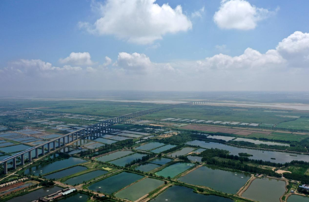 7月1日,无人机俯瞰黄河西侧陕西合阳段,万亩鱼塘与高铁交汇,景色如画。崔正博 摄