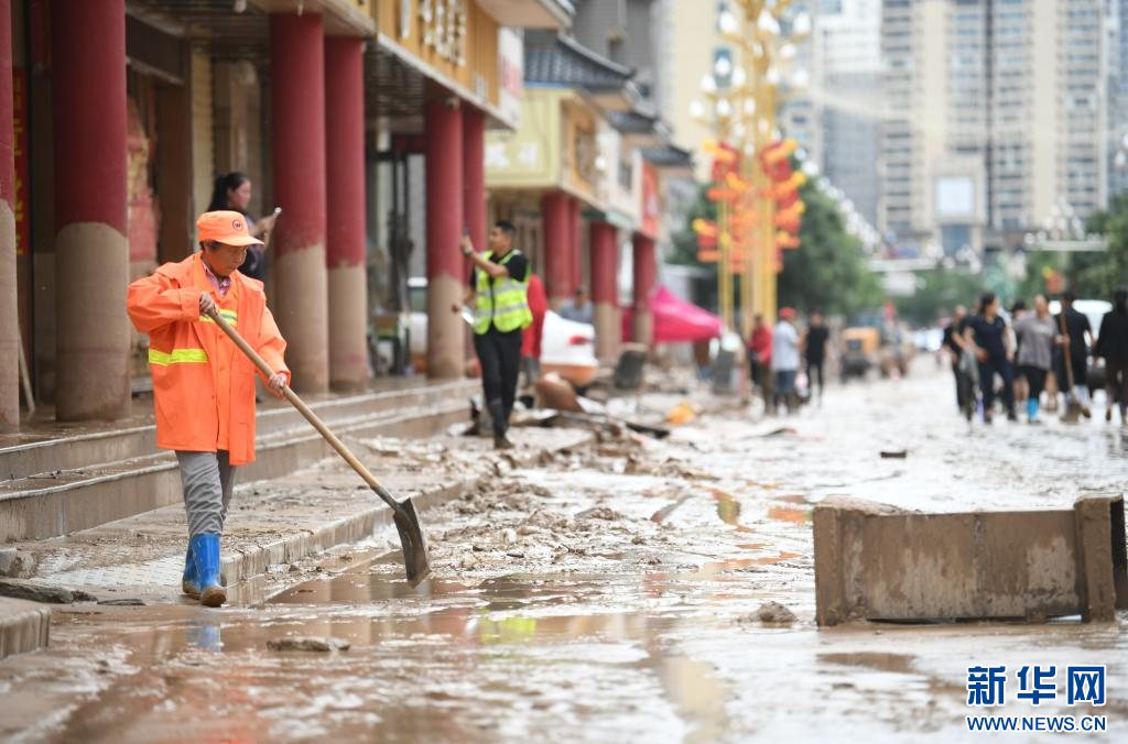7月26日,群众在吴起县城参与灾后清理工作。新华社记者 张博文 摄