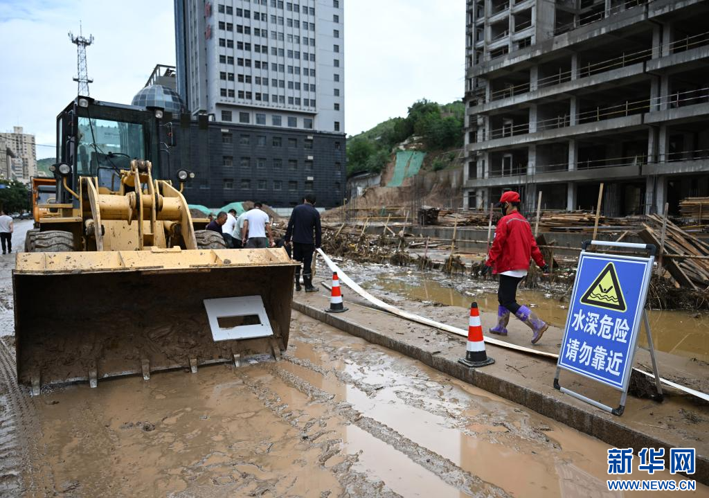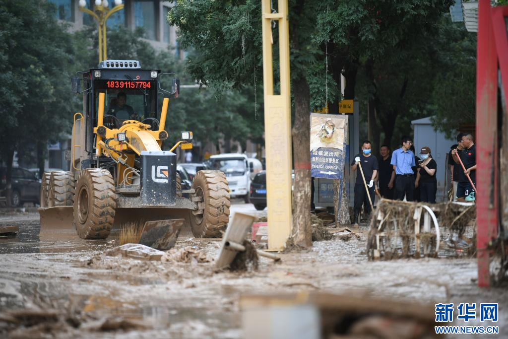 7月26日,救援车辆在吴起县街道进行清淤作业。新华社记者 张博文 摄pagebreak