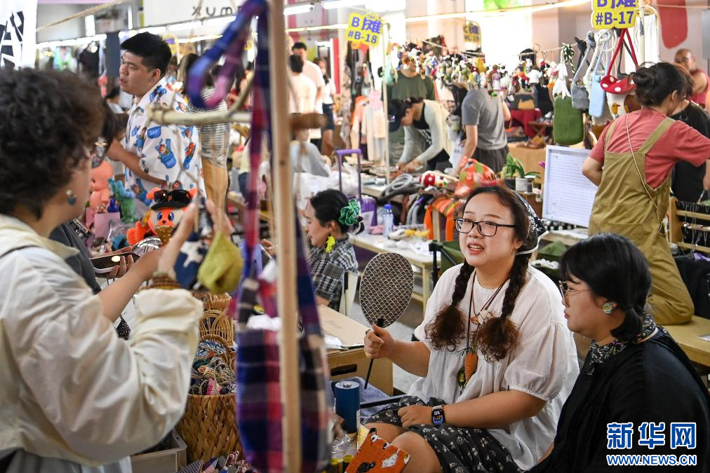 7月5日,摊主在西仓市集文创公园内的“新二手市集”上与游客交流。