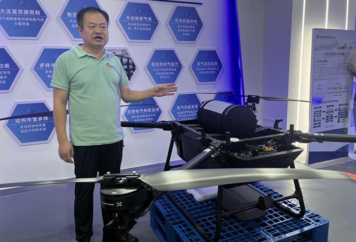 7月25日,盛世盈创副总经理聂小确介绍公司氢能无人机。新华网 郝云菲 摄