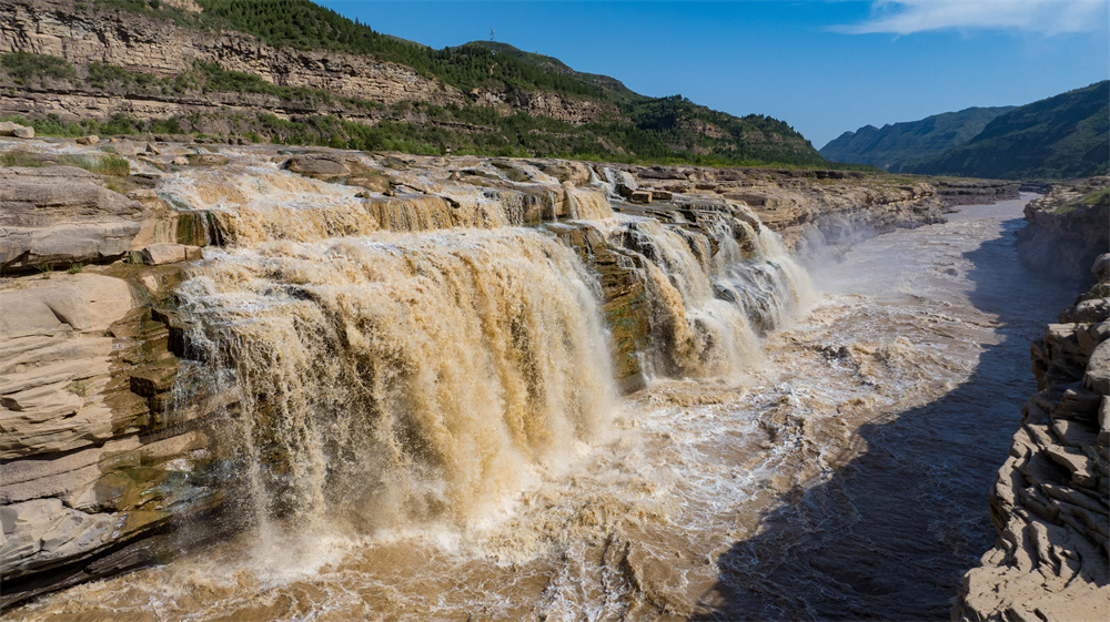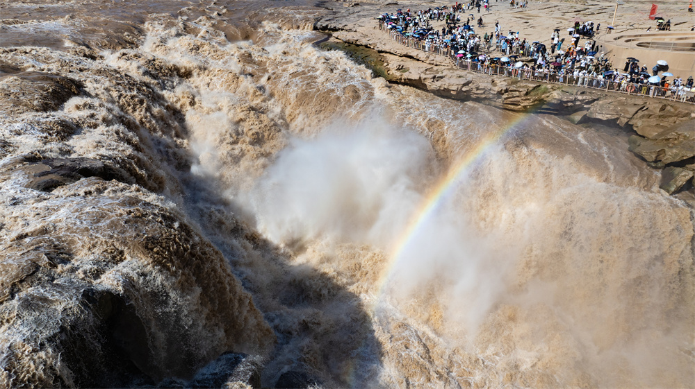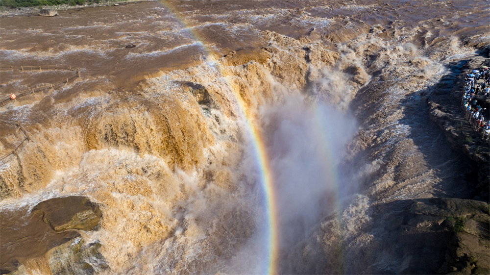 奔腾的黄河壶口瀑布吸引众多游客前来观赏。
