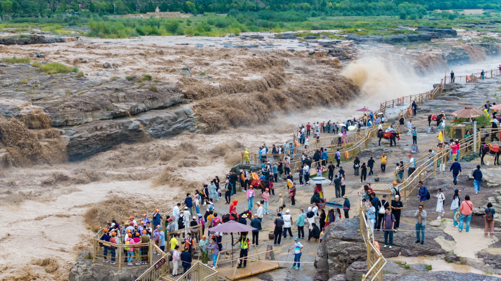 奔腾的黄河壶口瀑布吸引众多游客前来观赏。