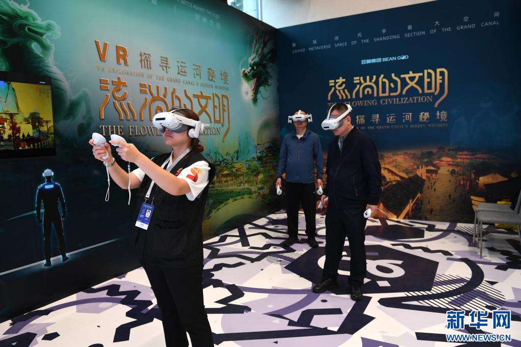 9月17日,与会嘉宾在论坛的文化遗产数字化精品项目展上体验大运河VR项目《流淌的文明》。