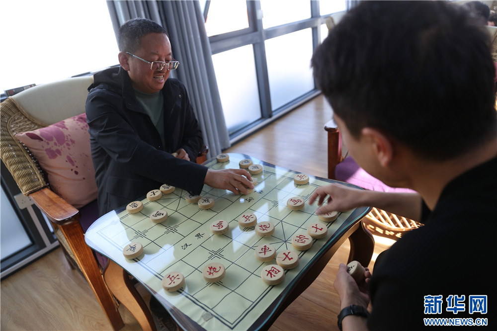 于卫刚在休息时间与工友进行娱乐活动。新华网 王智超摄