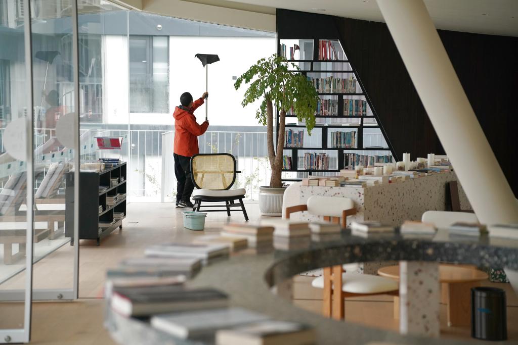 10月29日,在镇坪县牛头店镇国庆村,一家山居酒店工作人员在酒店书吧内打扫卫生。