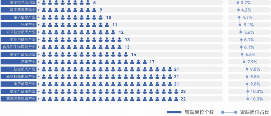 不同产业的紧缺岗位占比数据显示,高端装备制造产业与数字产品服务业的紧缺岗位占比最高,均为10.3% ,是紧缺岗位最集中的两大产业;电子信息产业、航空航天产业及新材料新能源产业紧随其后,紧缺岗位占比均达9.8%;汽车产业(7.9%)、数字产品制造业(6.5%),以及食品和生物医药产业、氢能与储能产业(均为6.1%)的紧缺岗位占比也相对较高;未来航空航天产业(5.6%)、光子产业(5.1%)的紧缺岗位占比处于中间水平;量子信息产业(4.7%)、数字要素驱动业(4.2%)、数字技术应用业(3.7%)的紧缺岗位占比较低。