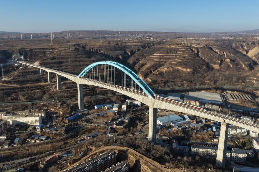 试验列车驶过西延高铁王家河特大桥。新华社记者 邢广利 摄