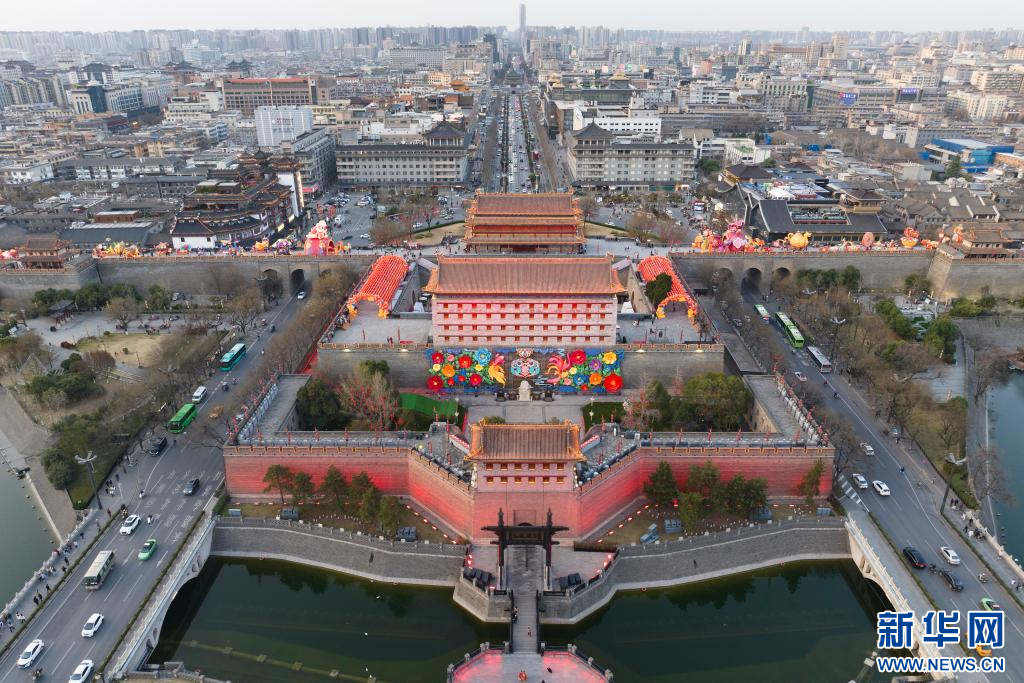 由南向北俯瞰西安城墙永宁门(2025年3月19日摄,无人机照片)。