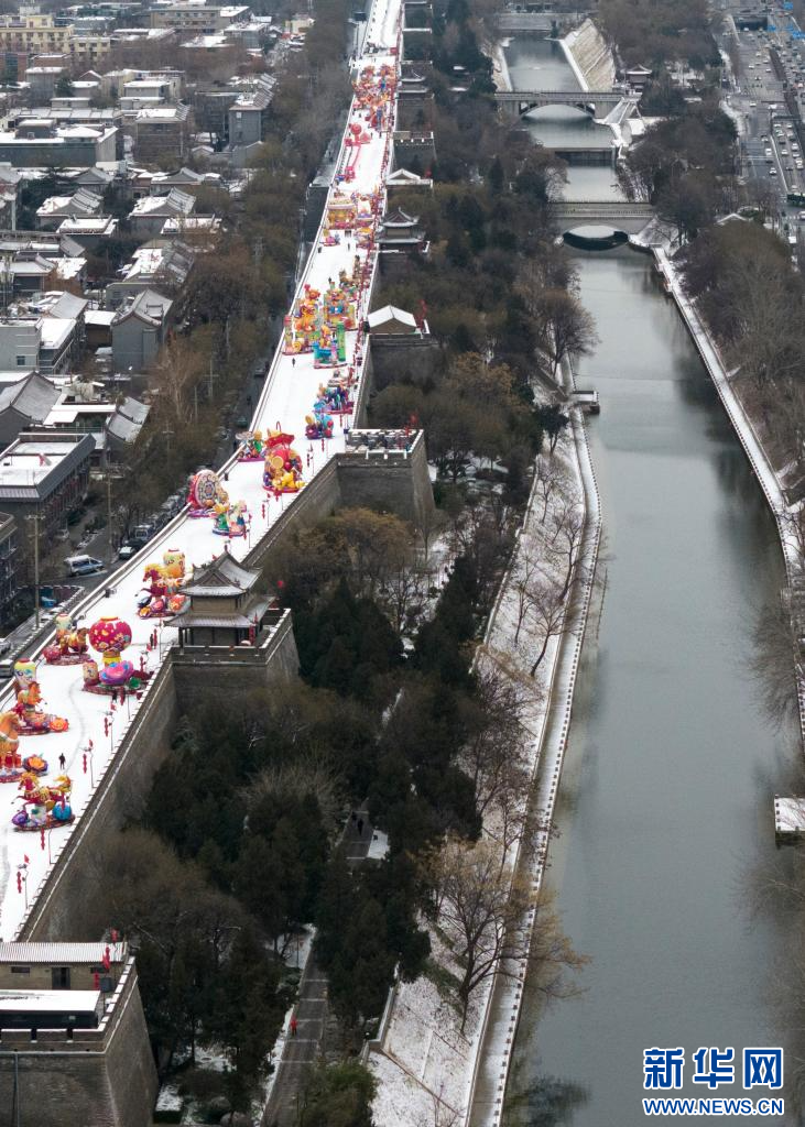 西安城墙及西安站前的西安护城河北段(无人机照片,1月20日摄)。
