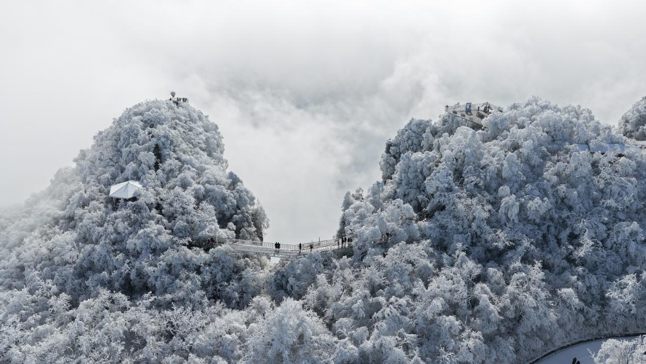 雪后初霁,汉中龙头山景区内云海与雾凇惊艳同框,绘就一幅幅令人心旷神怡的冬日画卷。漫步于悬空栈道,游客们沉醉于这高山冰雪与云海交织的壮美之中,近距离感受大自然的鬼斧神工。整座山巅被雾凇温柔覆盖,云海如浪般在脚下铺展!(张婷婷)pagebreak