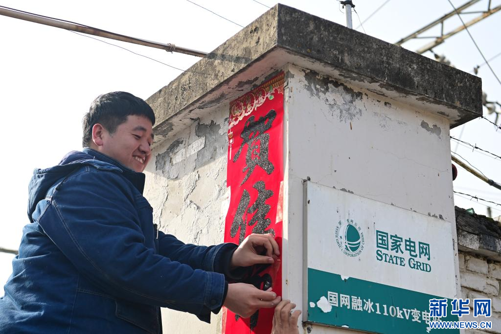 1月28日,国网宝鸡供电公司输电运检中心秦岭输电运维班成员赵鹤在变电站张贴新春对联。新华社记者 邹竞一 摄