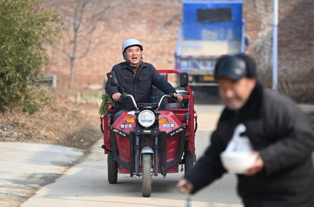 2月6日,庞富强骑着三轮车在里峪湾村为村中老人送午饭。