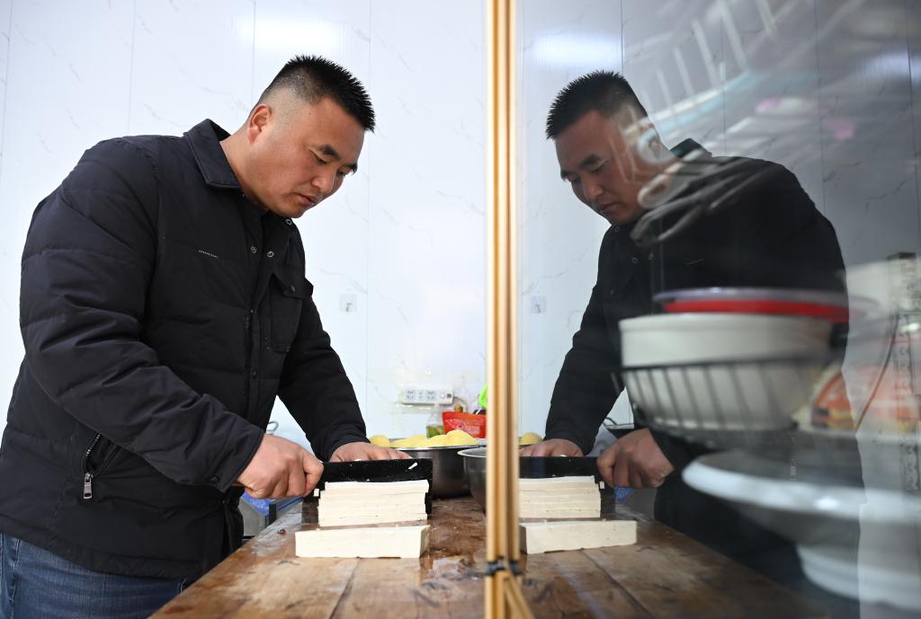 2月6日,庞富强(前)和弟弟庞富斌在家中制作当天的午饭。