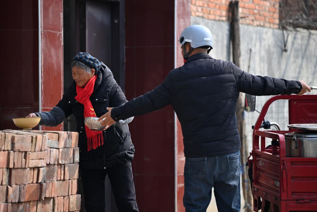 2月6日,庞富强为里峪湾村中的老人送午饭。