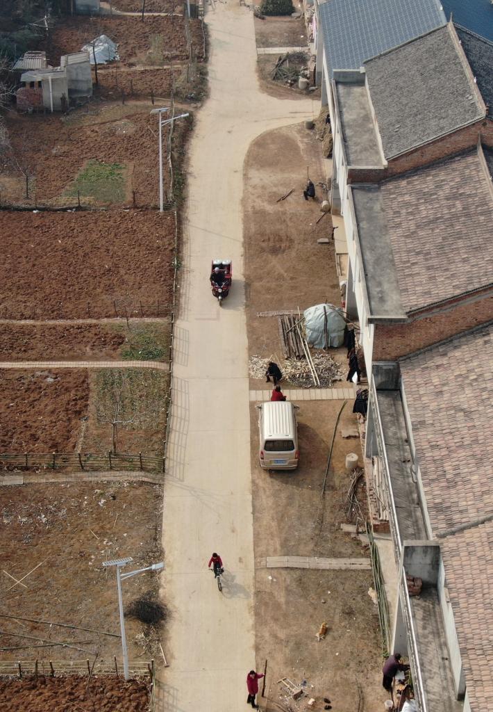 2月6日,庞富强骑着三轮车在里峪湾村为村中老人送午饭(无人机照片)。