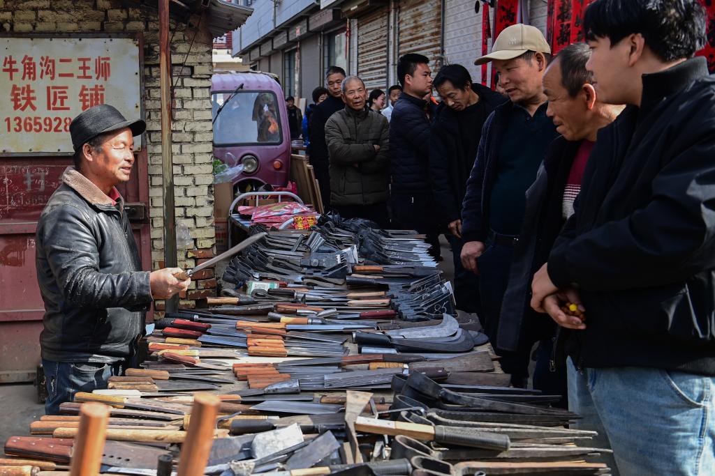 2月13日,游客在焦岱大集上了解铁制品。