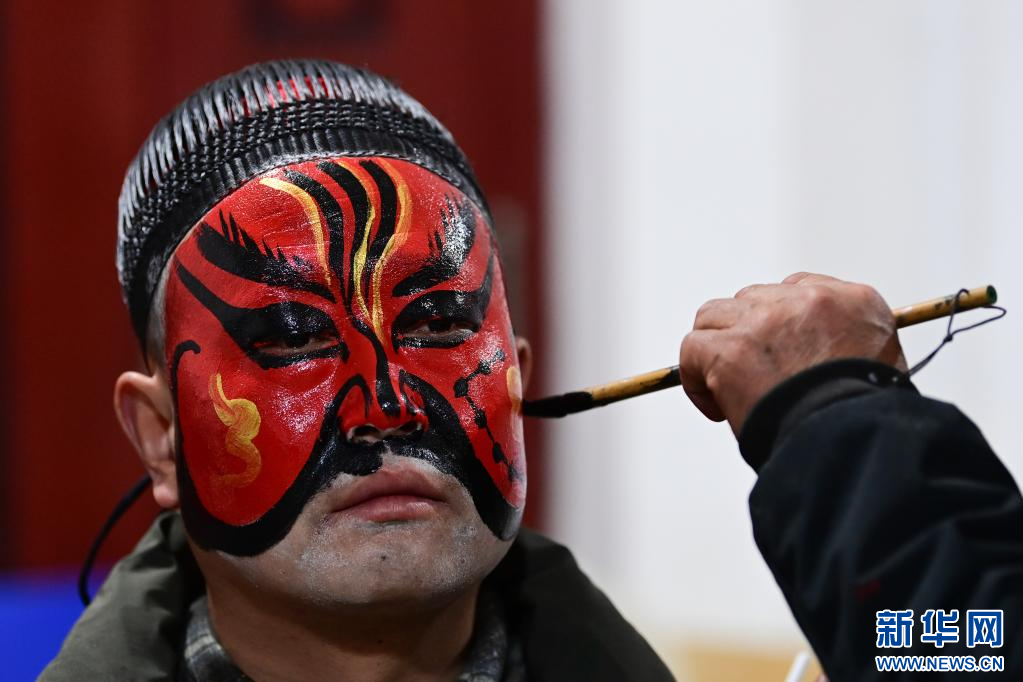 3月2日凌晨,老艺人为陇县黄花峪村社火队队员绘制社火脸谱。新华社记者 邹竞一 摄pagebreak