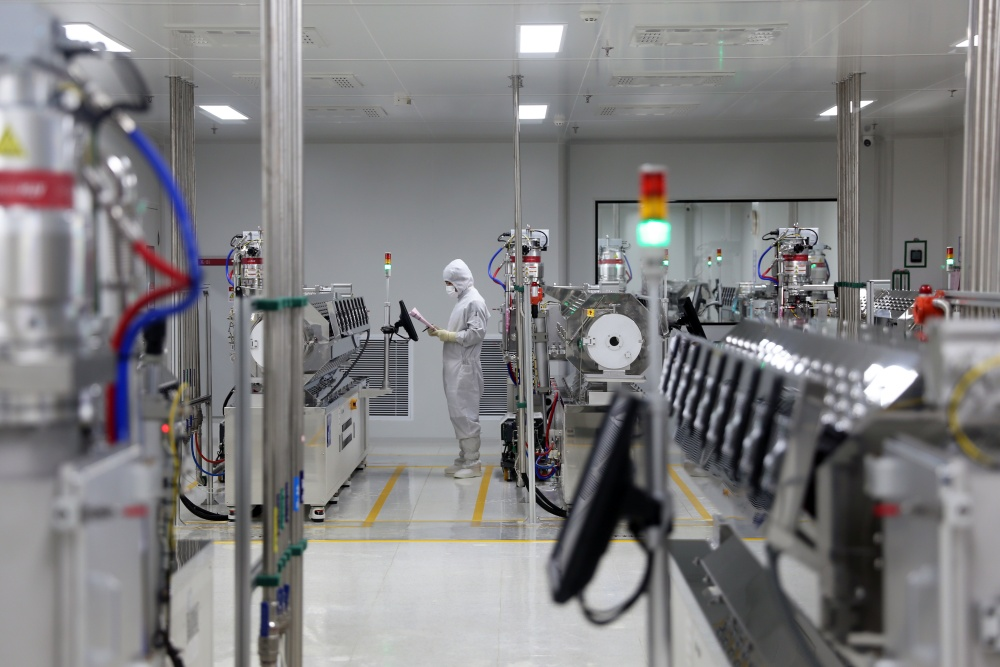 工作人员在陕西莱特光电材料股份有限公司升华生产车间工作。新华网 王智超摄