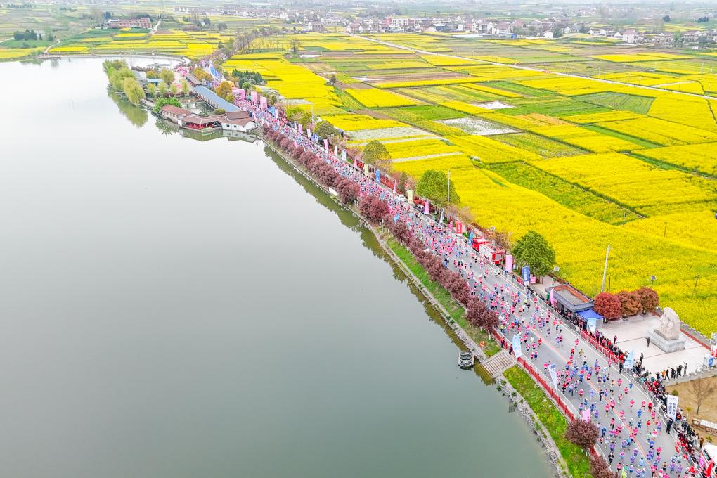 伴随着清脆的发令声响,3000名选手冲出起跑线,从汉中市汉台区皇塘水乡景区观花点出发,一路向前至梁徐路核心观花线路折返,全长21.0975公里。赛道两旁,连绵的油菜花随风起伏,市民和志愿者挥舞着彩旗呐喊加油,沿途的民俗非遗展演点好戏连台,让奔跑者挥洒汗水之余,沉浸在自然美景与人文风貌中。