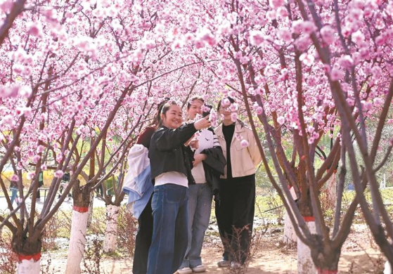 清明假期,延安以花为媒,将赏花转化为可感可及的多元消费体验,让“春日经济”绽放别样活力。图为4月5日,市民游客在延安新区鲁艺生态公园踏青游玩,打卡拍照。 本报通讯员 王德荣摄