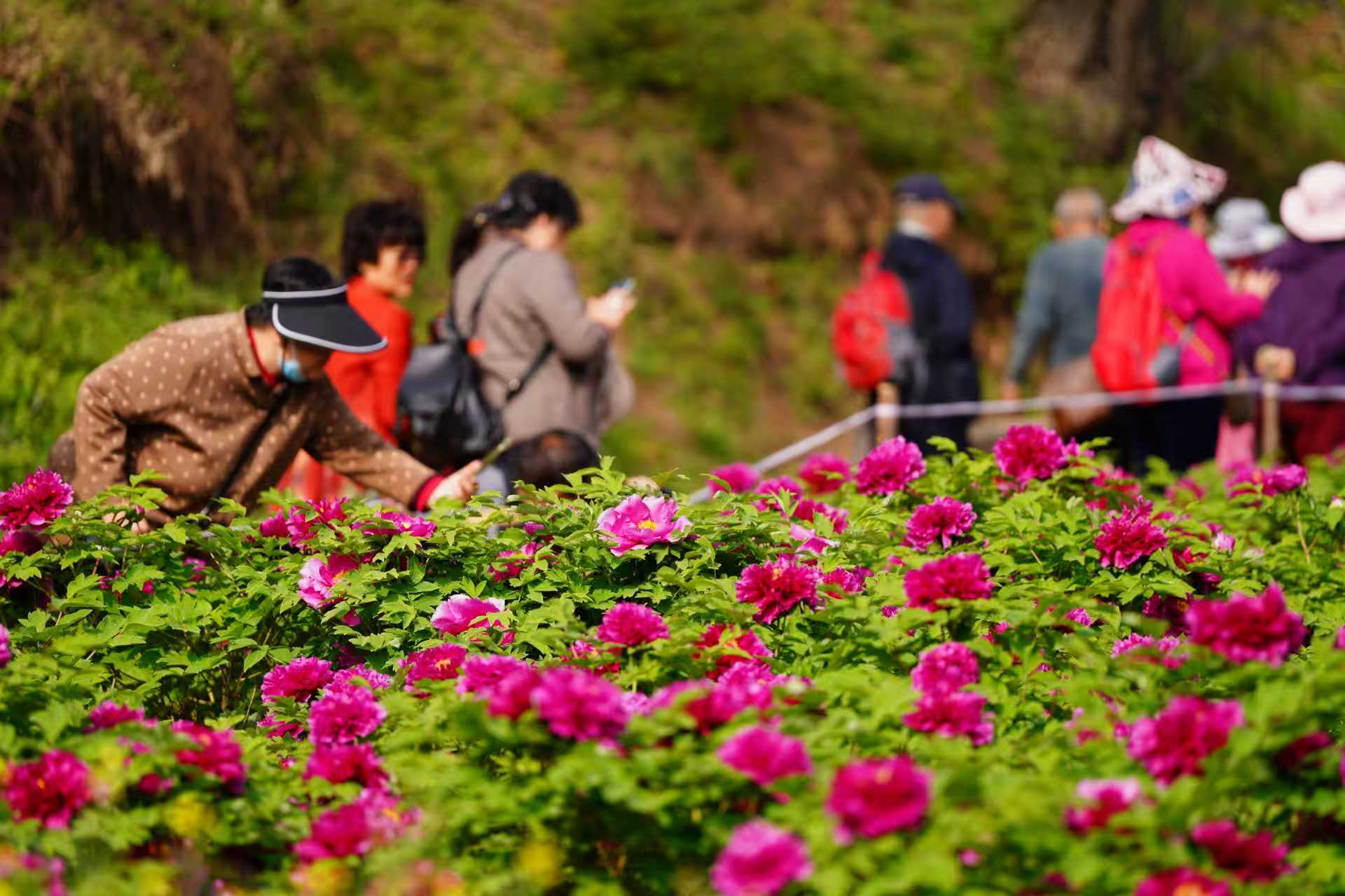 牡丹花沿着山势梯田层叠,竞相绽放。