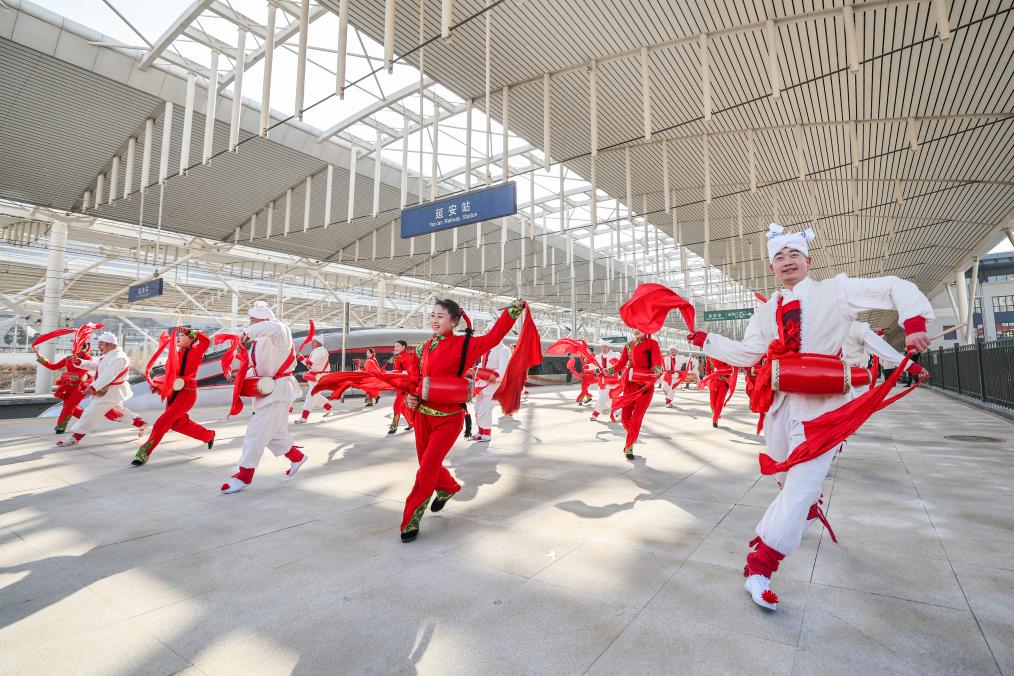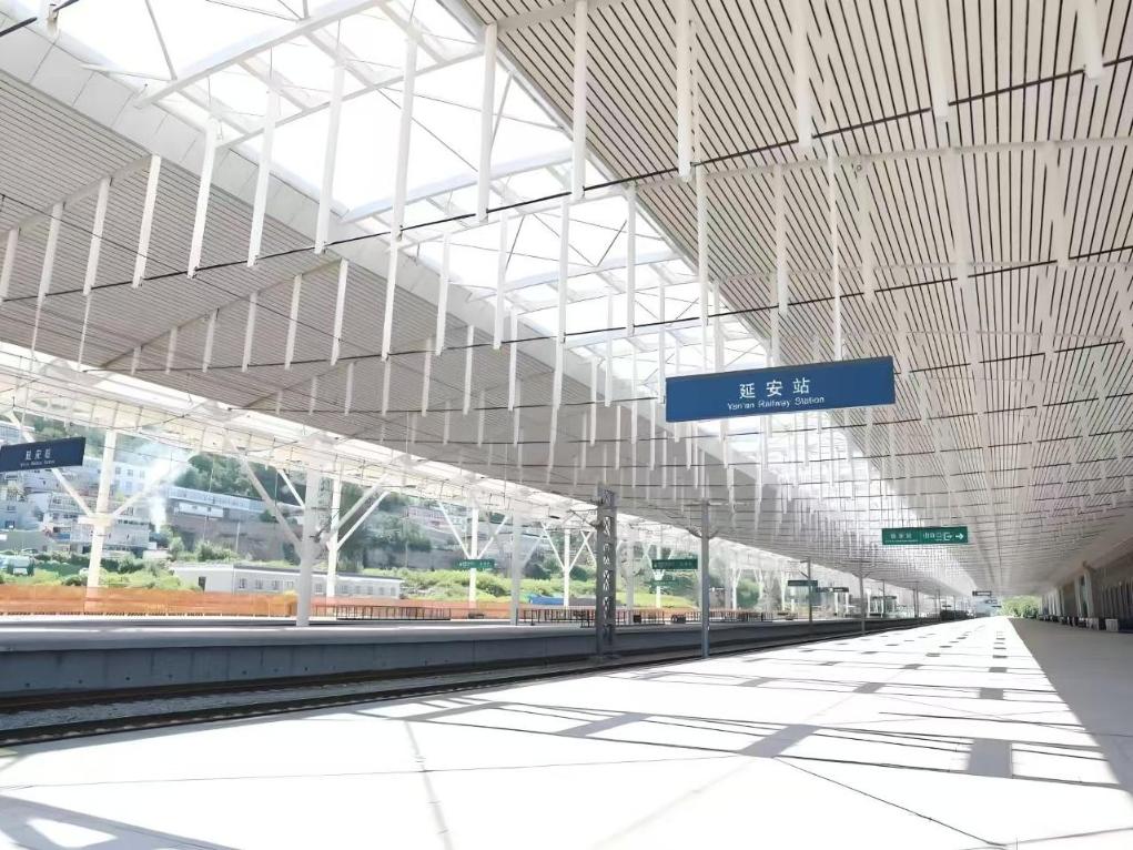 清晨的延安站,流线型的“复兴号”列车静伏轨上,宛如银白色箭矢,蓄势待发。不远处,宝塔山坐落于阳光之中。历史与未来,仿佛在此刻交相辉映。